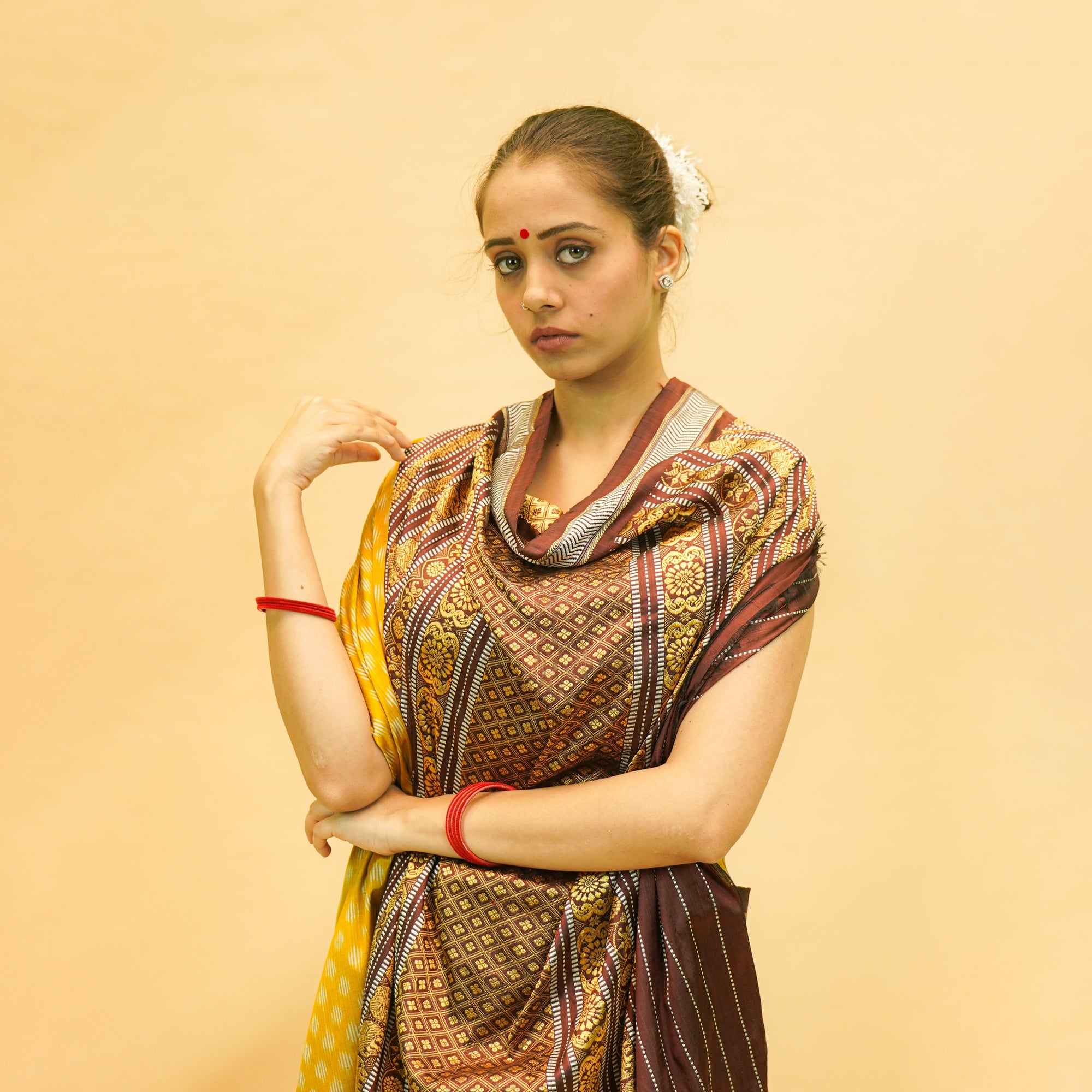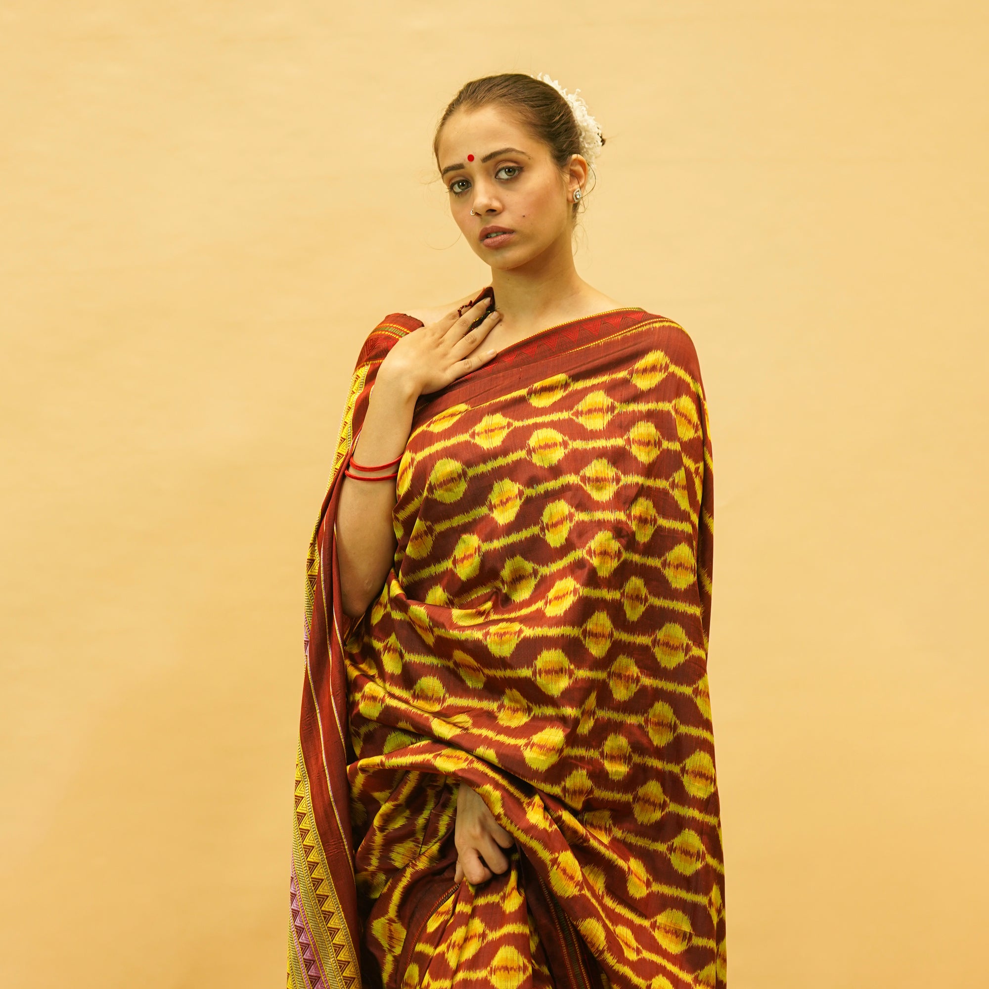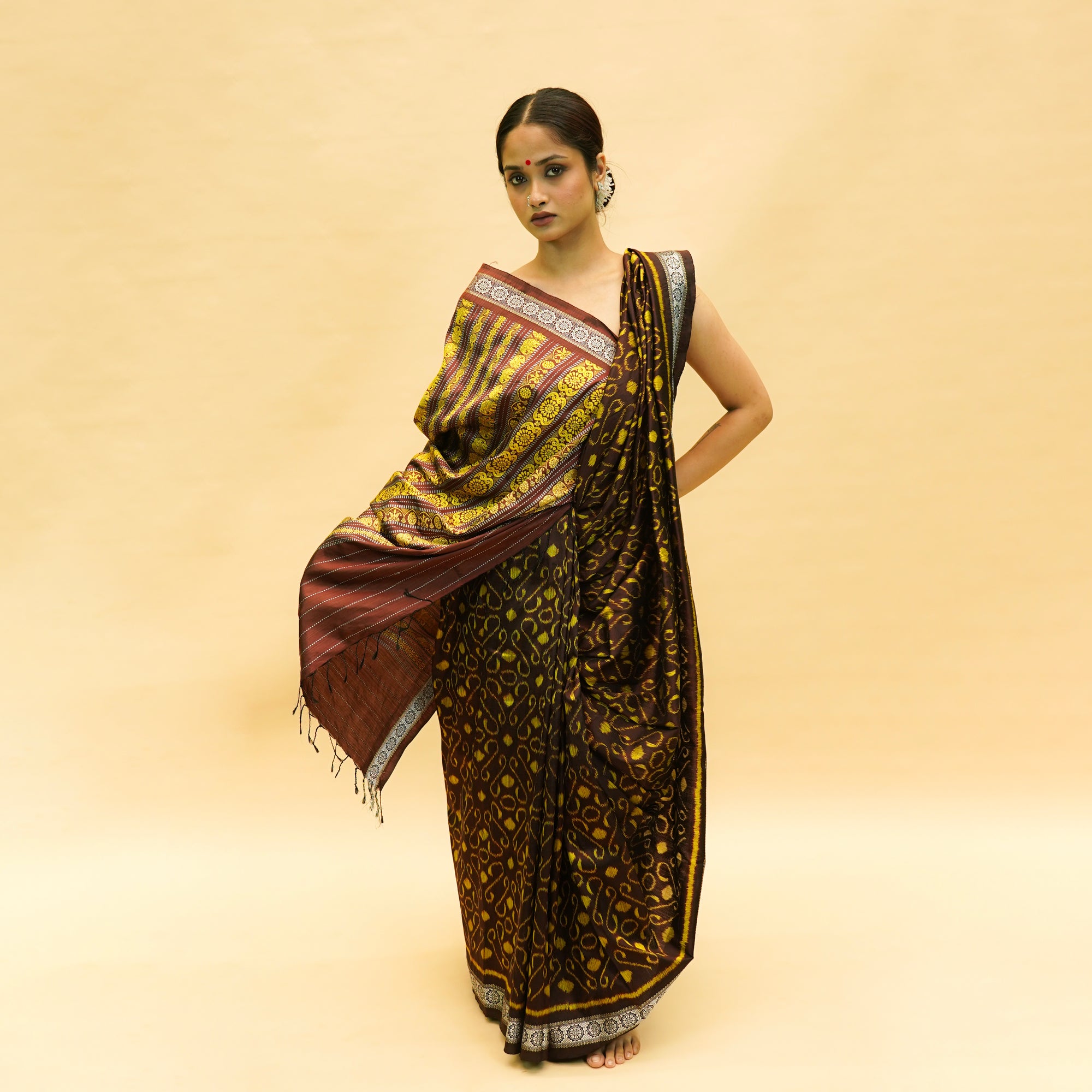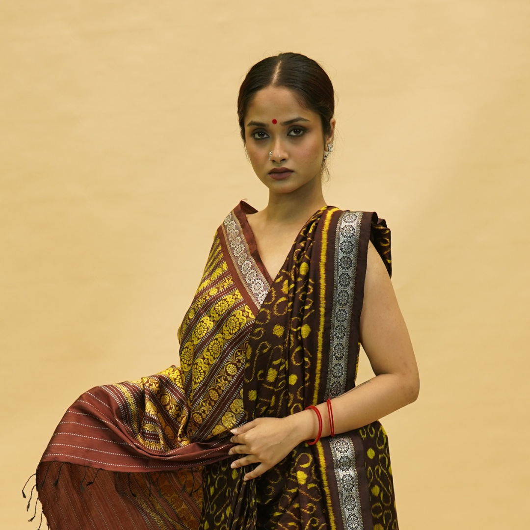 Chocolate Brown & Yellow Mulberry Silk Odisha Ikat Saree
