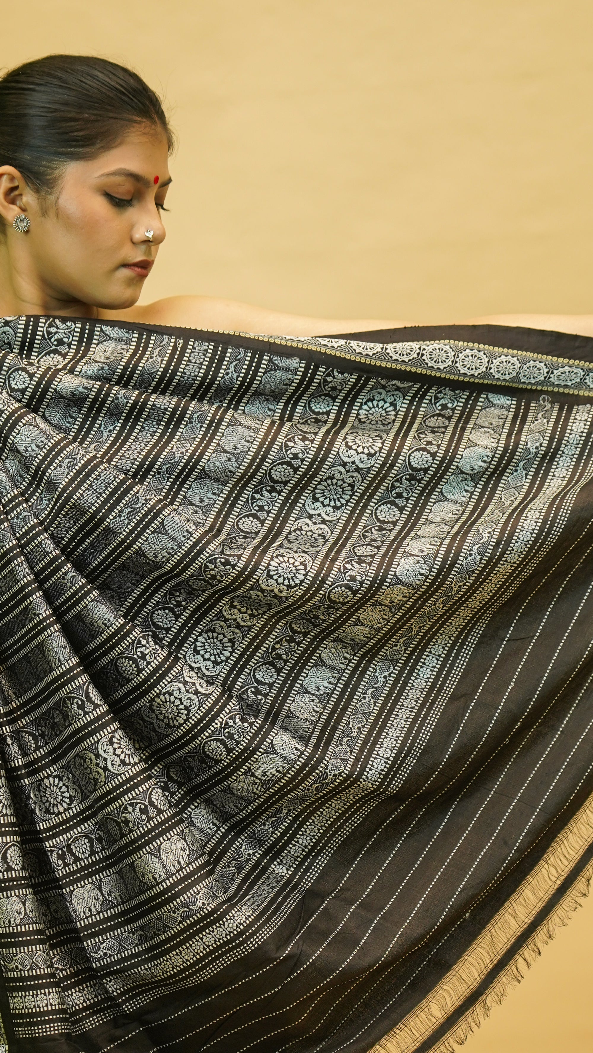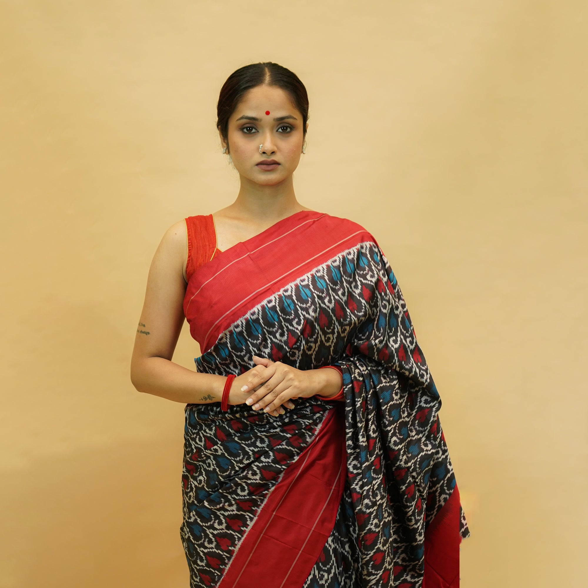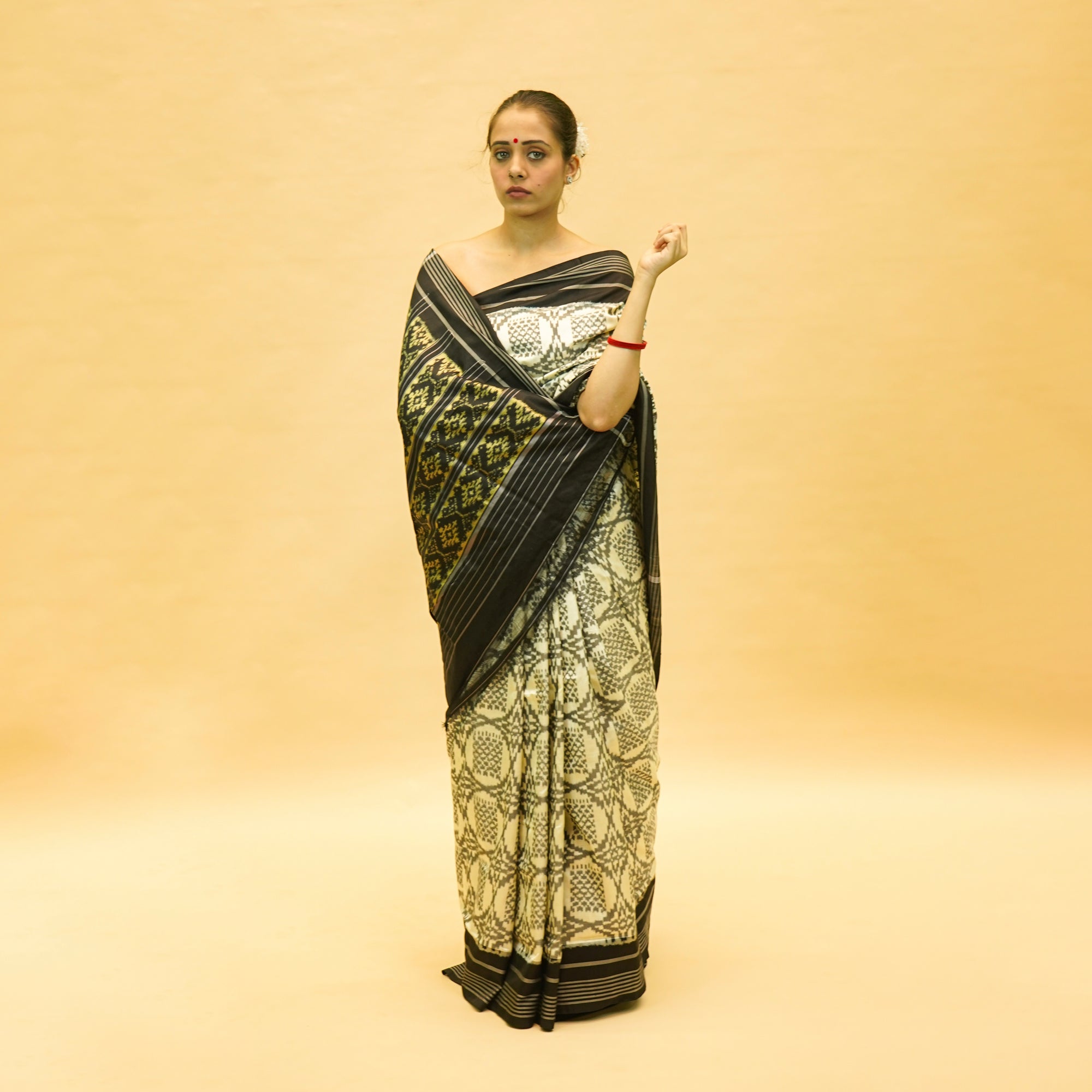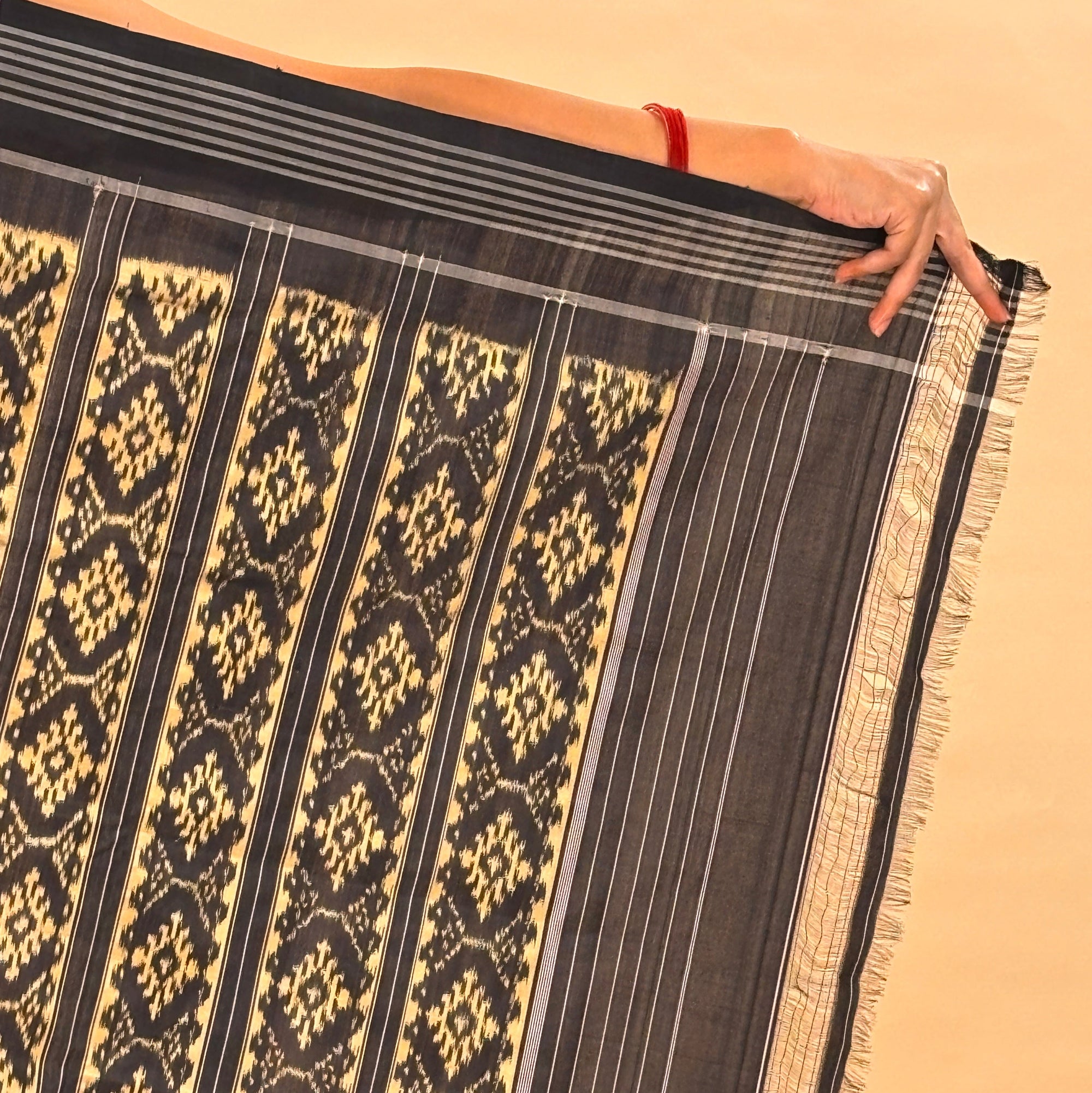 Black & Grey Mulberry Silk Odisha Ikat Saree with Chakra Border