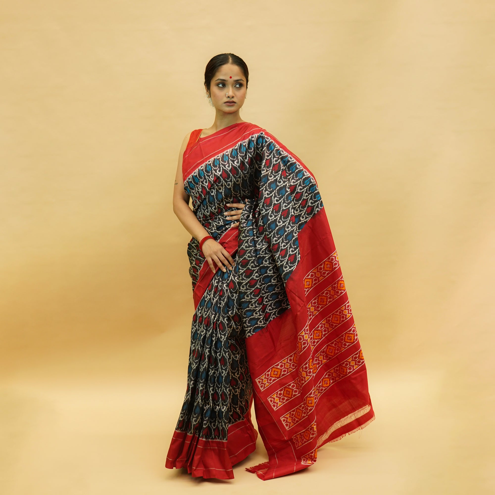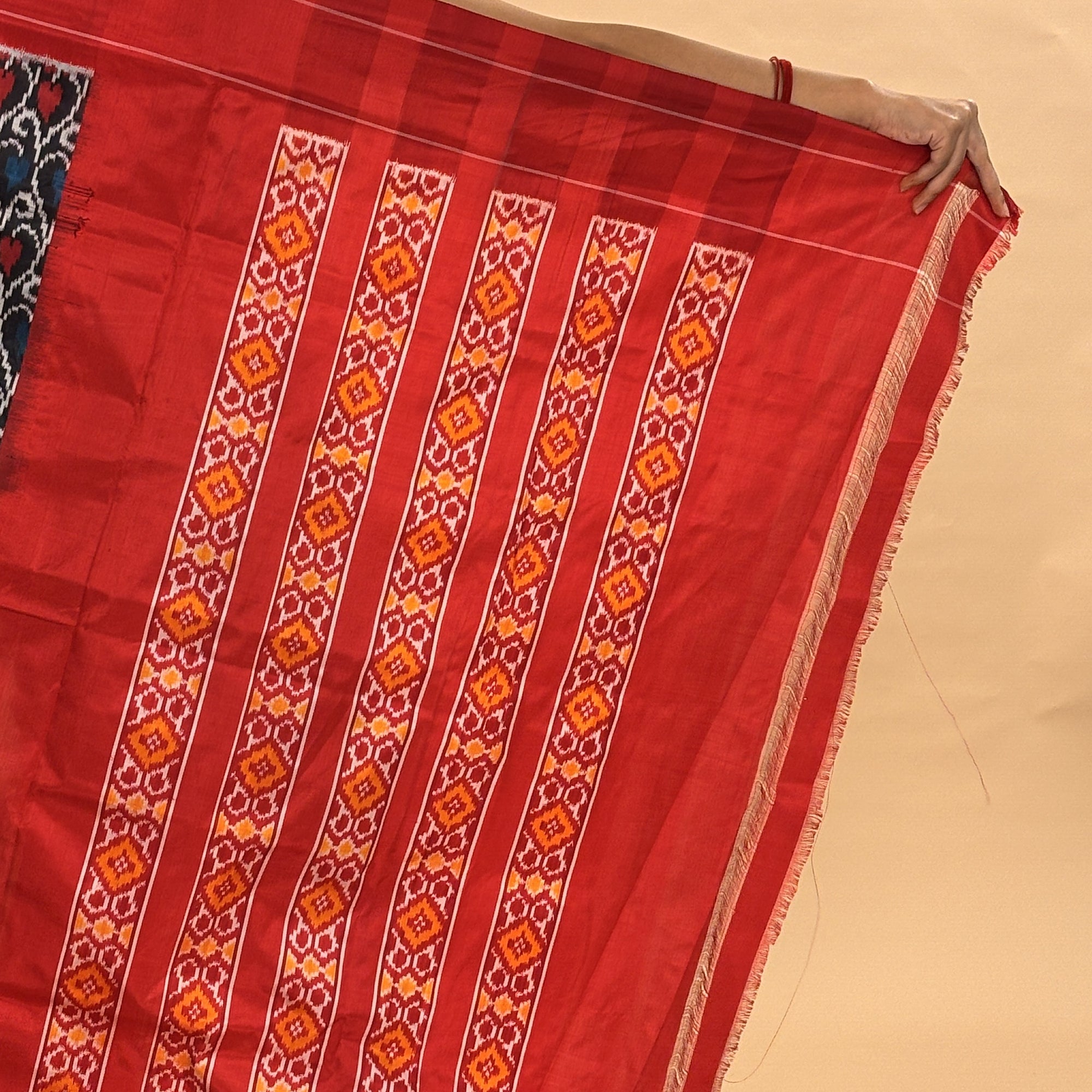 Red & Dark Blue Mulberry Silk Pochampally Ikat Saree