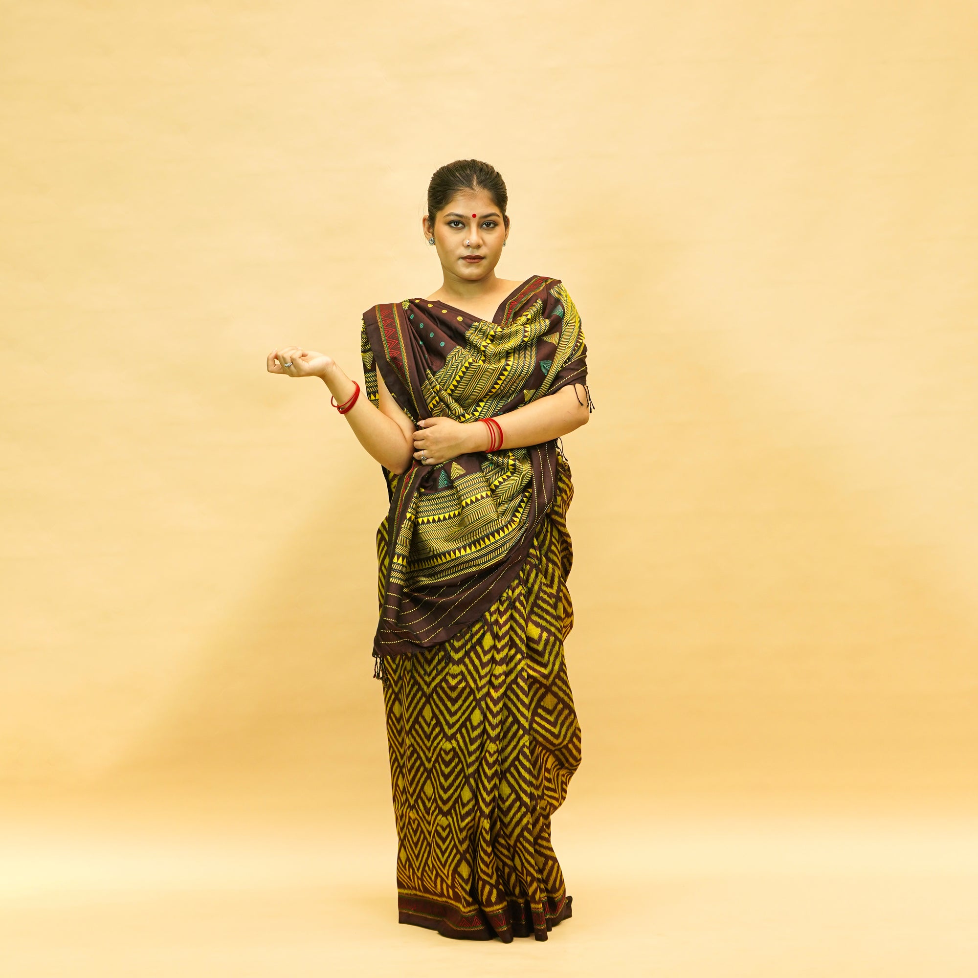 Dark Brown & Yellow Mulberry Silk Odisha Ikat Saree with Zig-Zag Border
