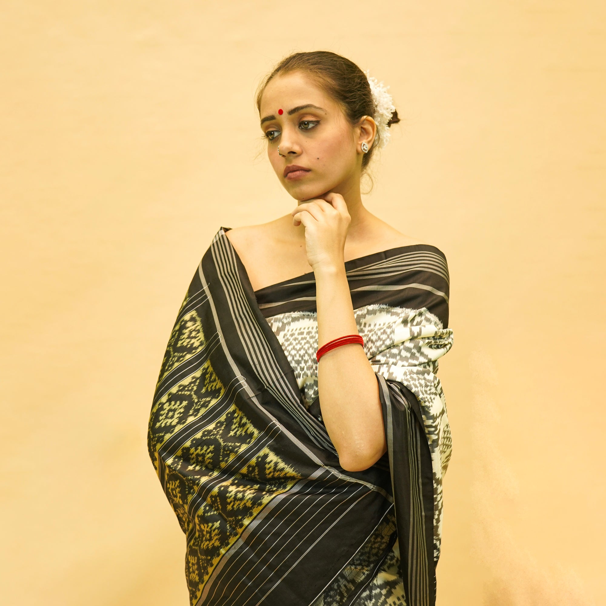 Black & White Mulberry Silk Pochampally Double Warp Ikat Saree