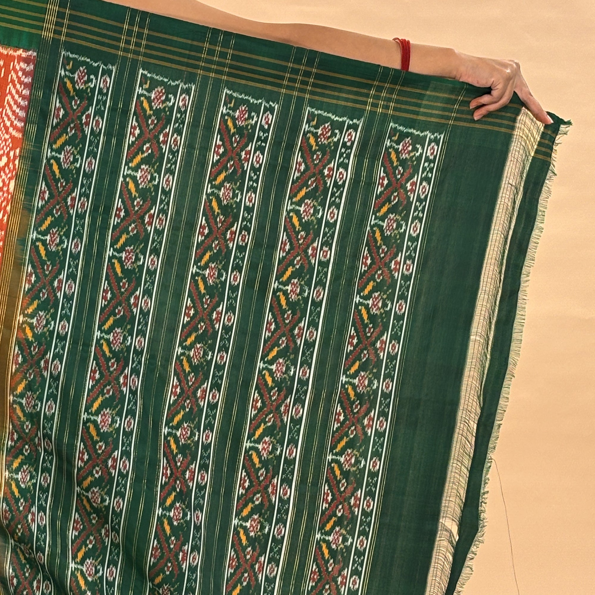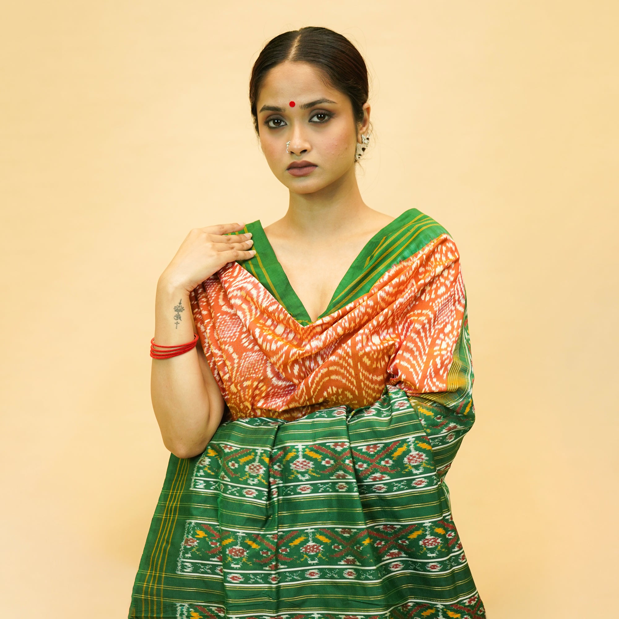Rust Orange & Green Mulberry Silk Pochampally Ikat Saree