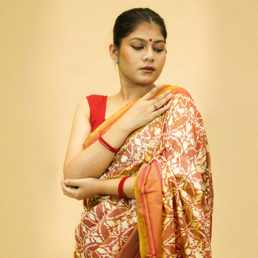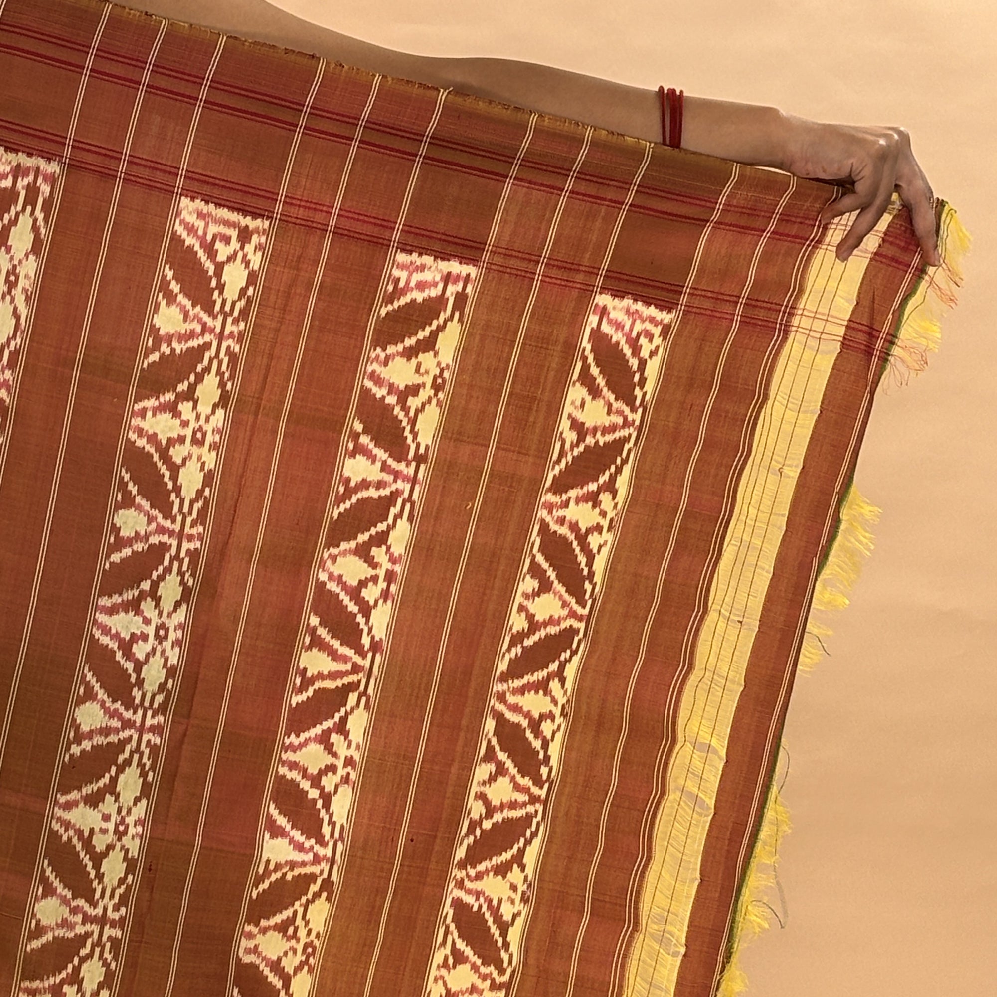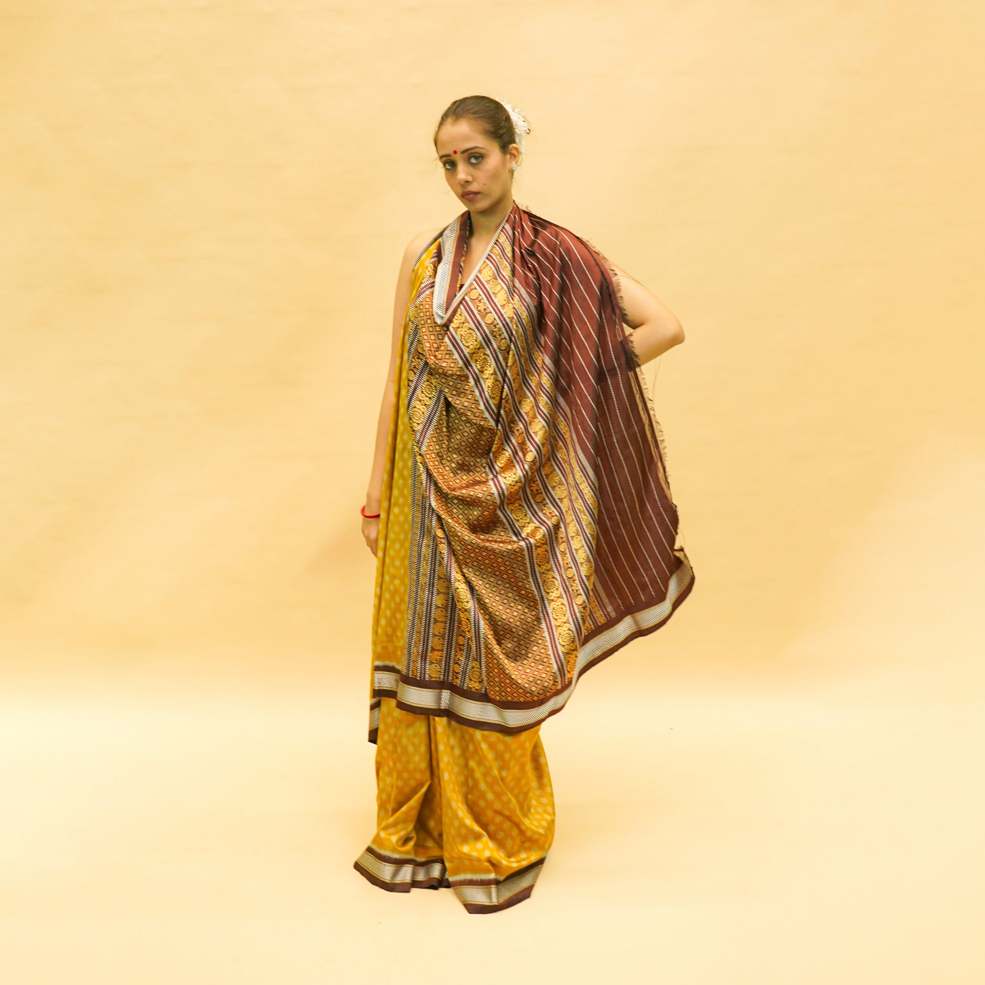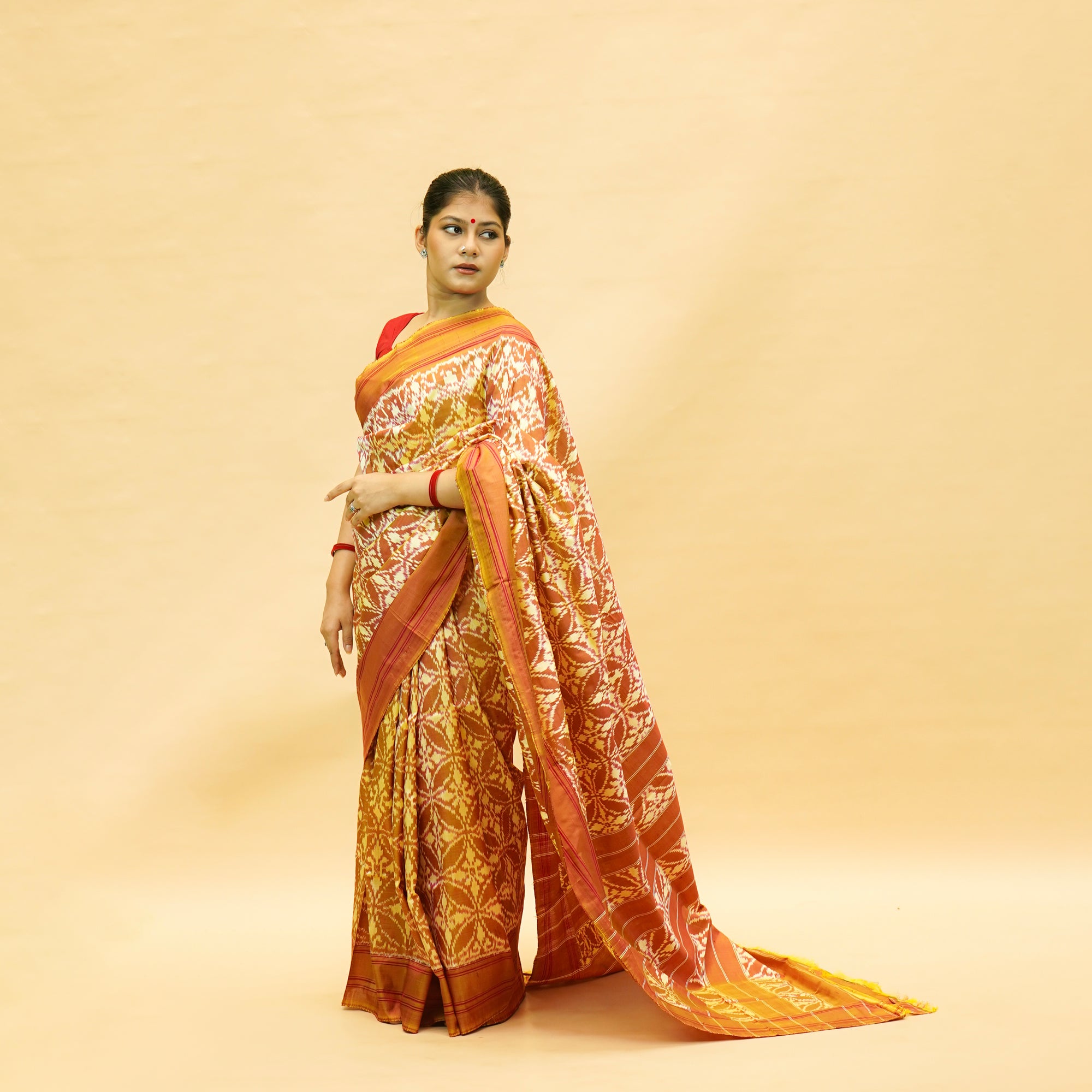 Dark Yellow & Brown Mulberry Silk Odisha Ikat Saree