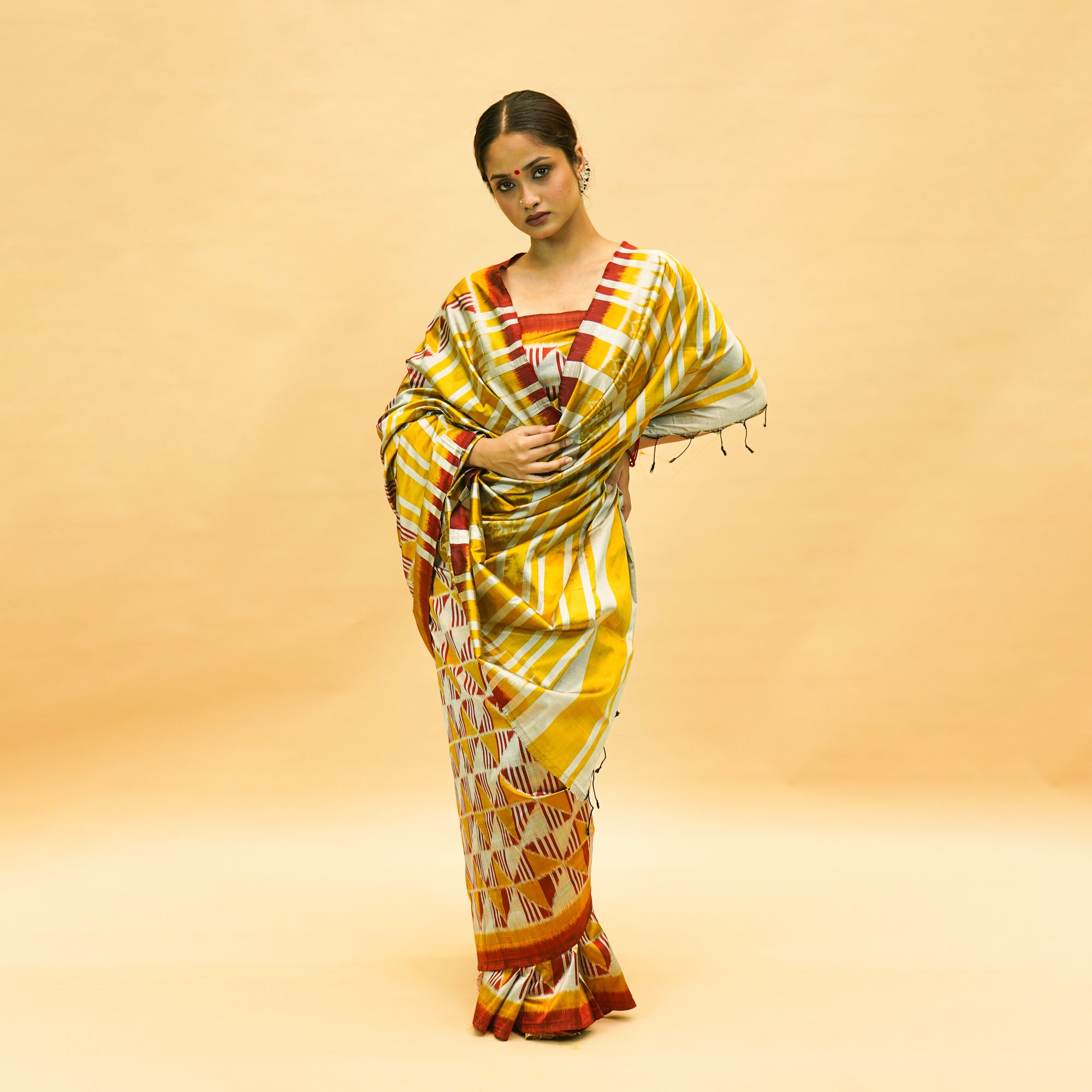 Mustard Yellow Mulberry Silk Uzbek-Style Double Warp Ikat Saree