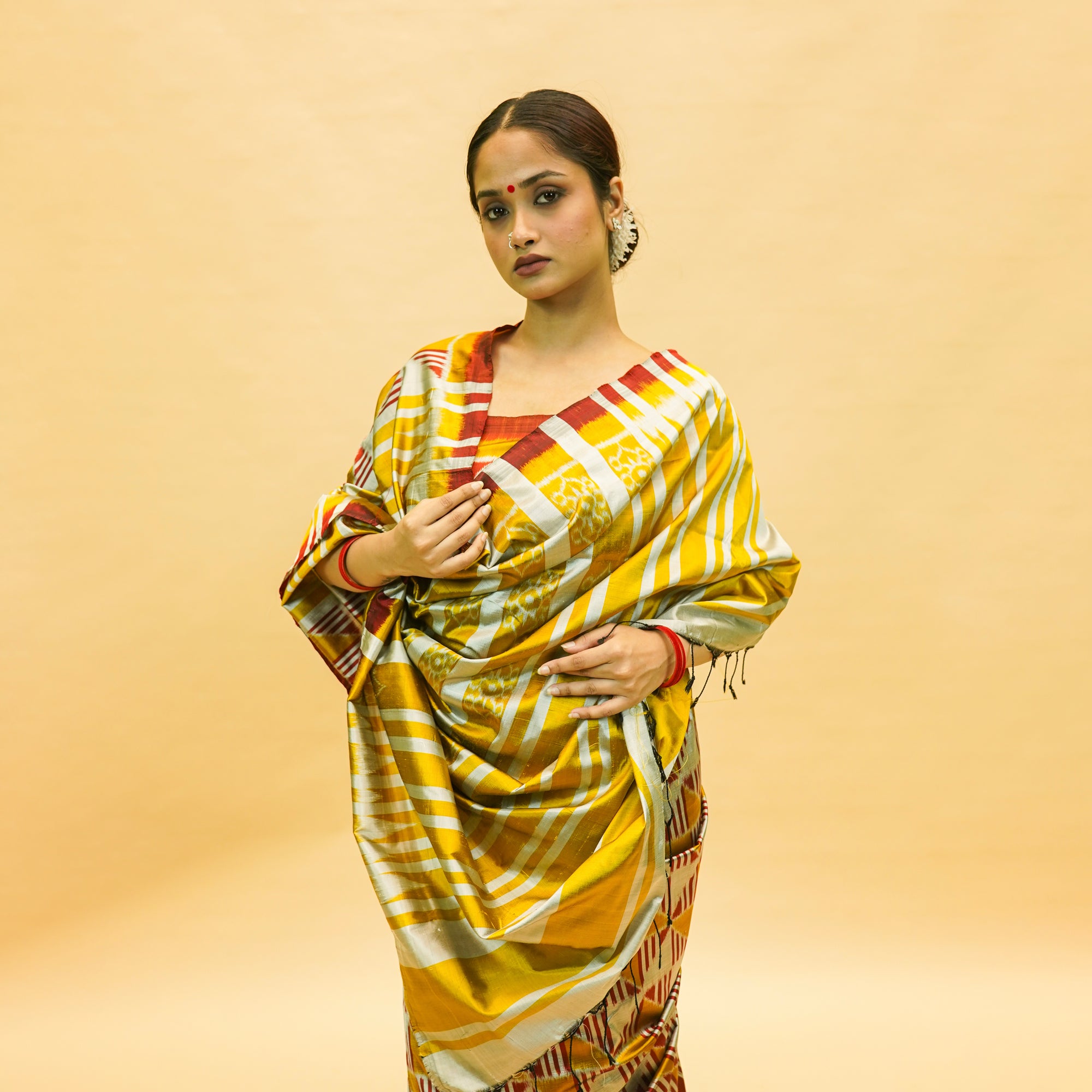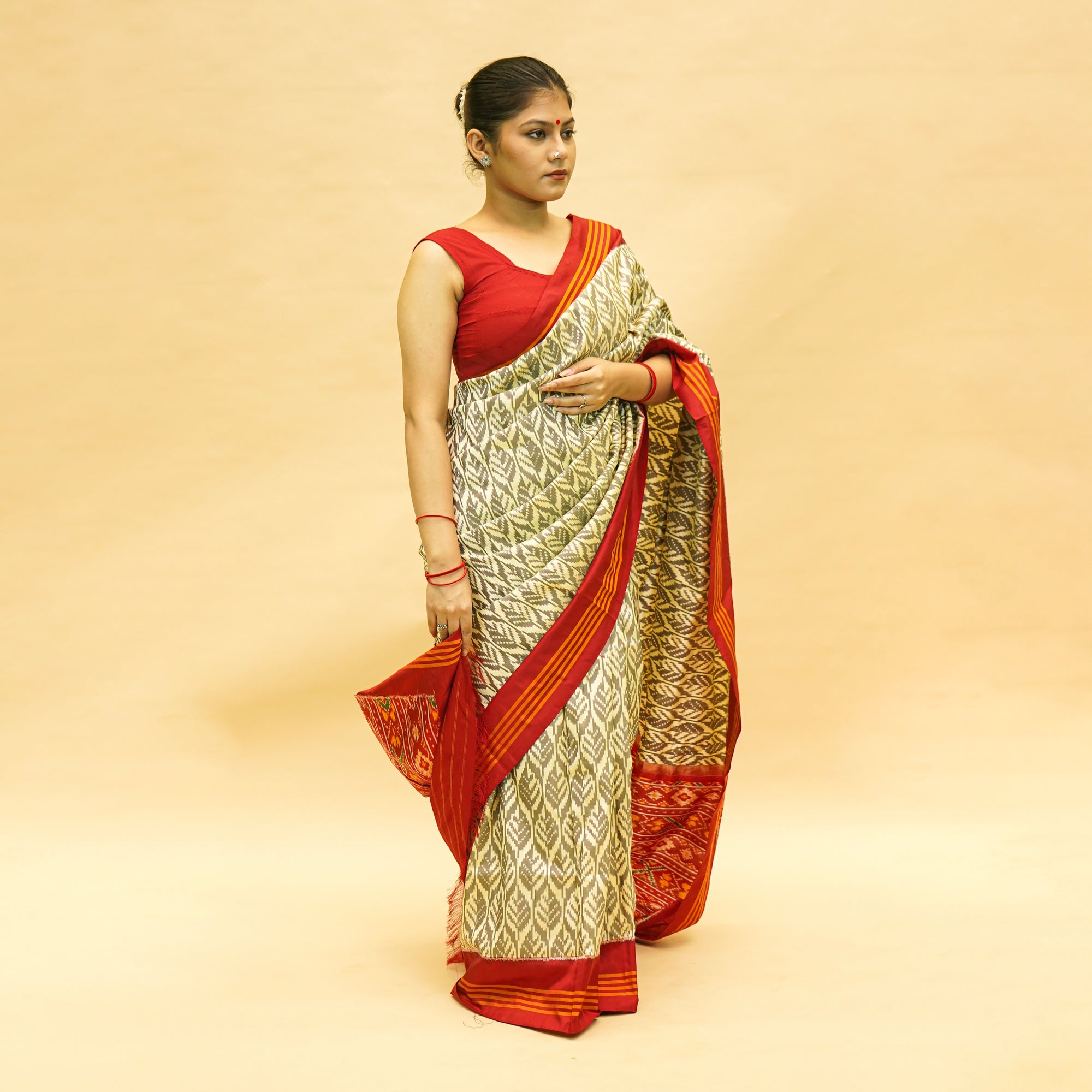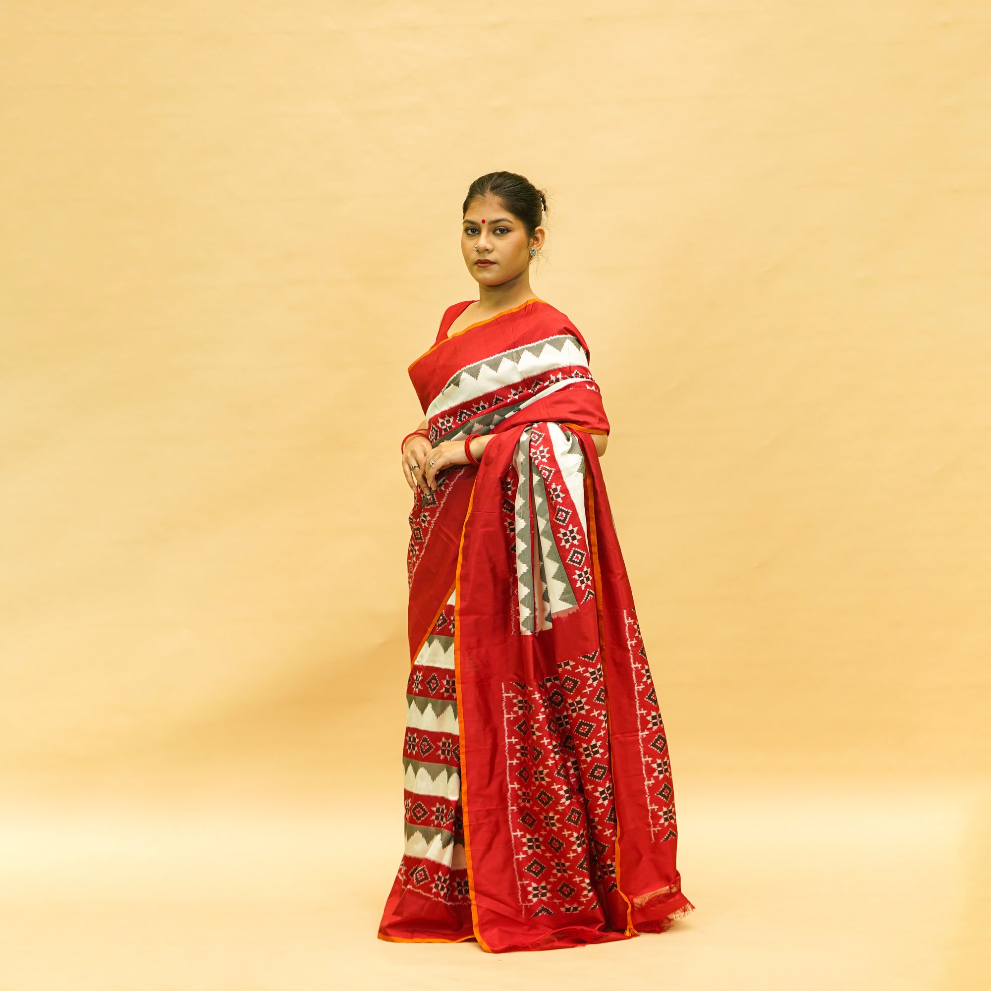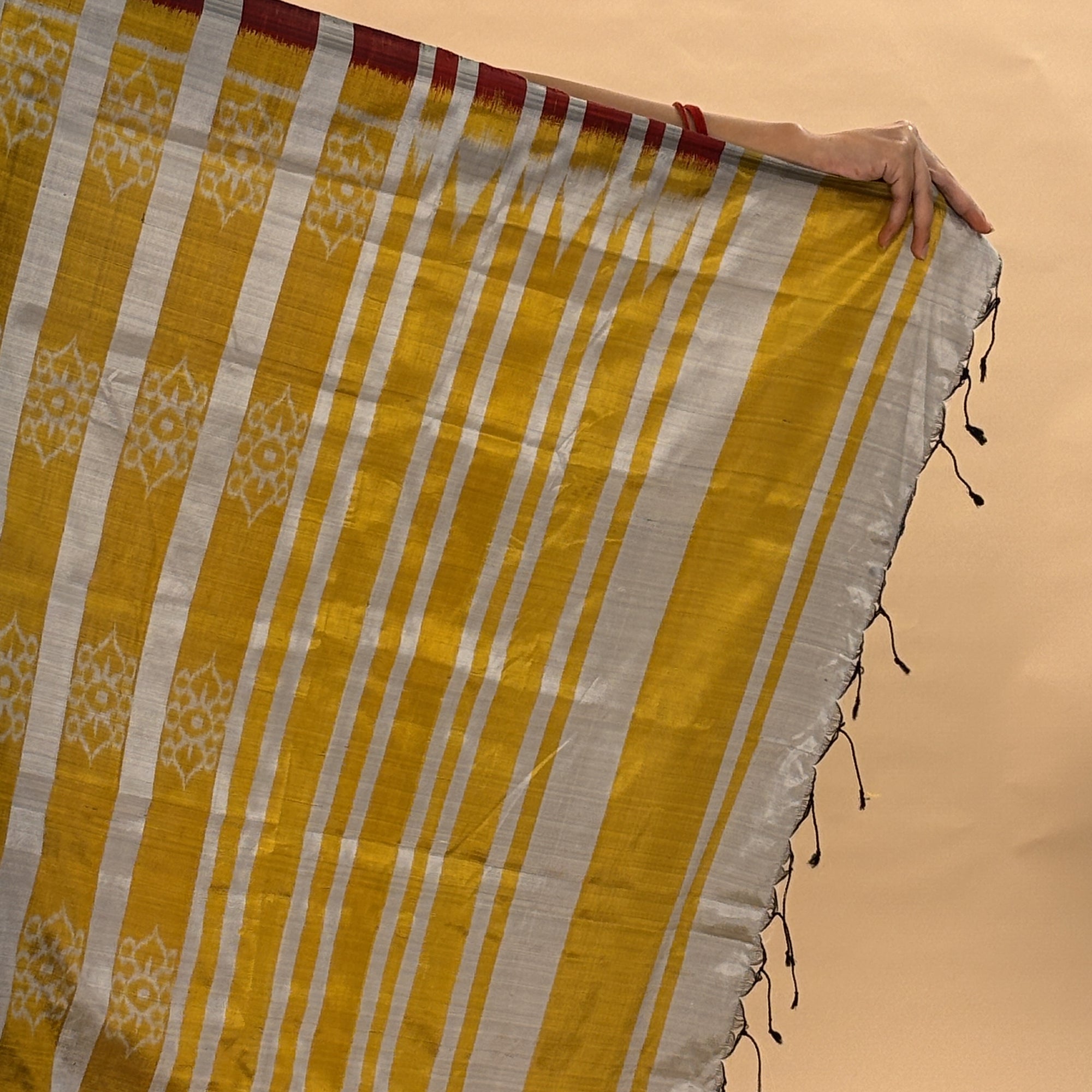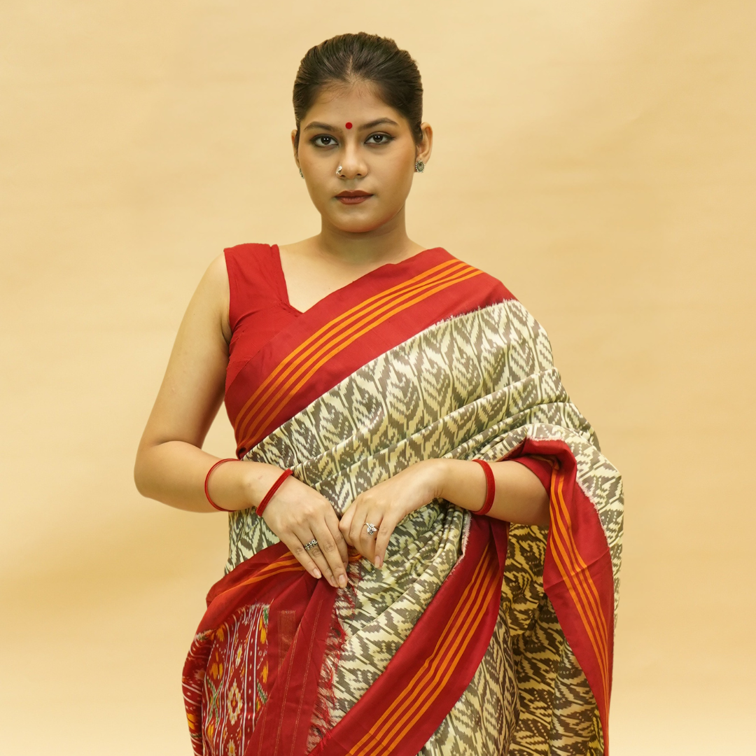 Golden & Silver With Red Mulberry Silk Odisha Ikat Saree