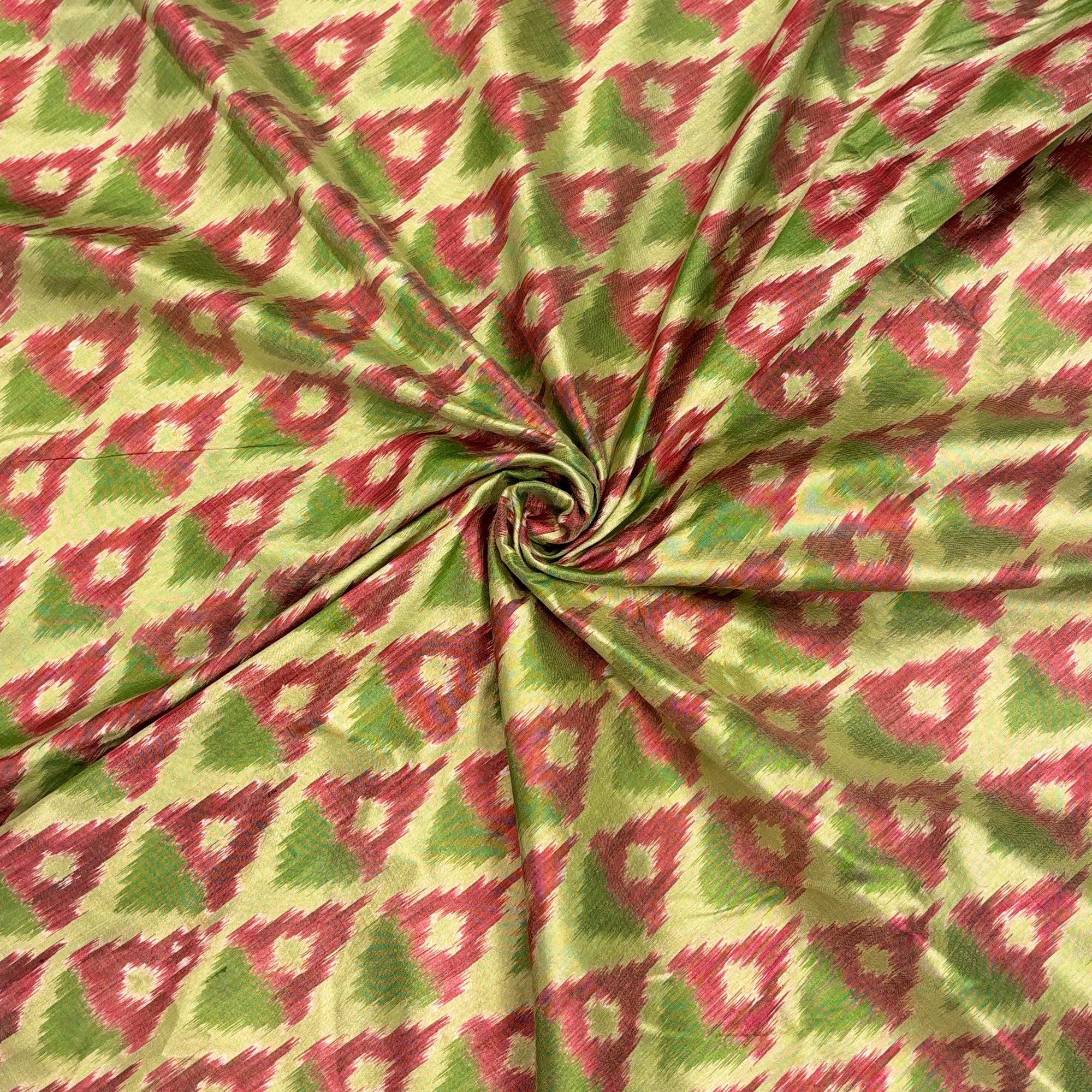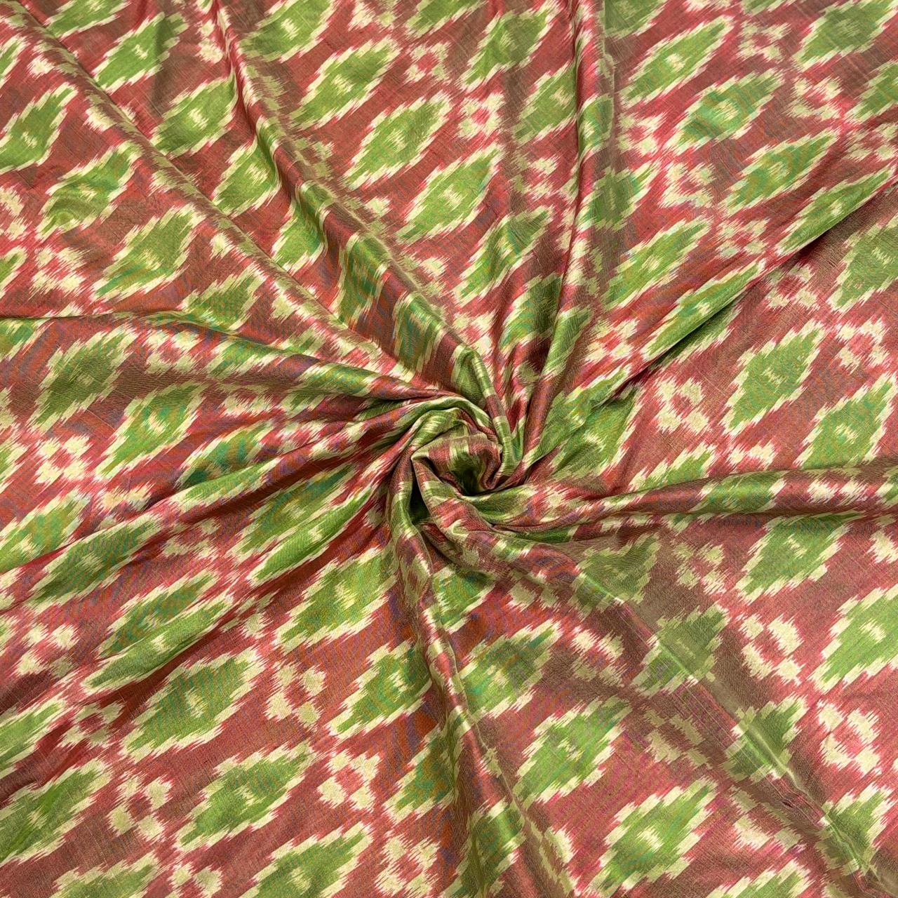 Green & Dark Pink Mulberry Silk Pochampally Ikat Fabric